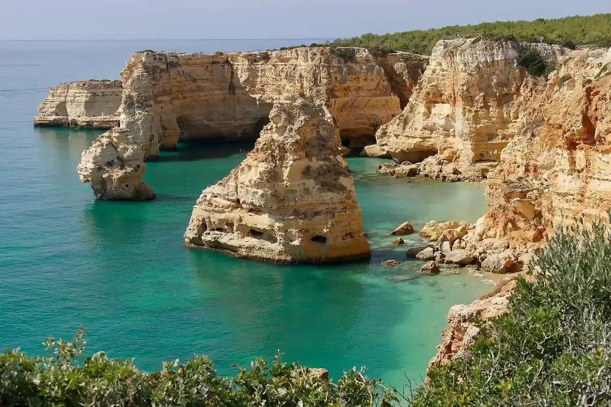 Praia da Marinha appears on nearly every list of the most beautiful beaches in the world, and standing at the clifftop viewpoint, you understand why. The beach unfolds below in a composition of golden sand, turquoise water, and limestone sea arches that seem designed for photographs. Twin rock formations frame the shore; at certain angles, the arches align perfectly with the morning light. Even in the shoulder seasons, April through May, or September through October, this beach draws visitors. Arrive early in the morning or late afternoon to avoid both the crowds and the harsh midday sun. The large parking lot above fills quickly by mid-morning in summer.
