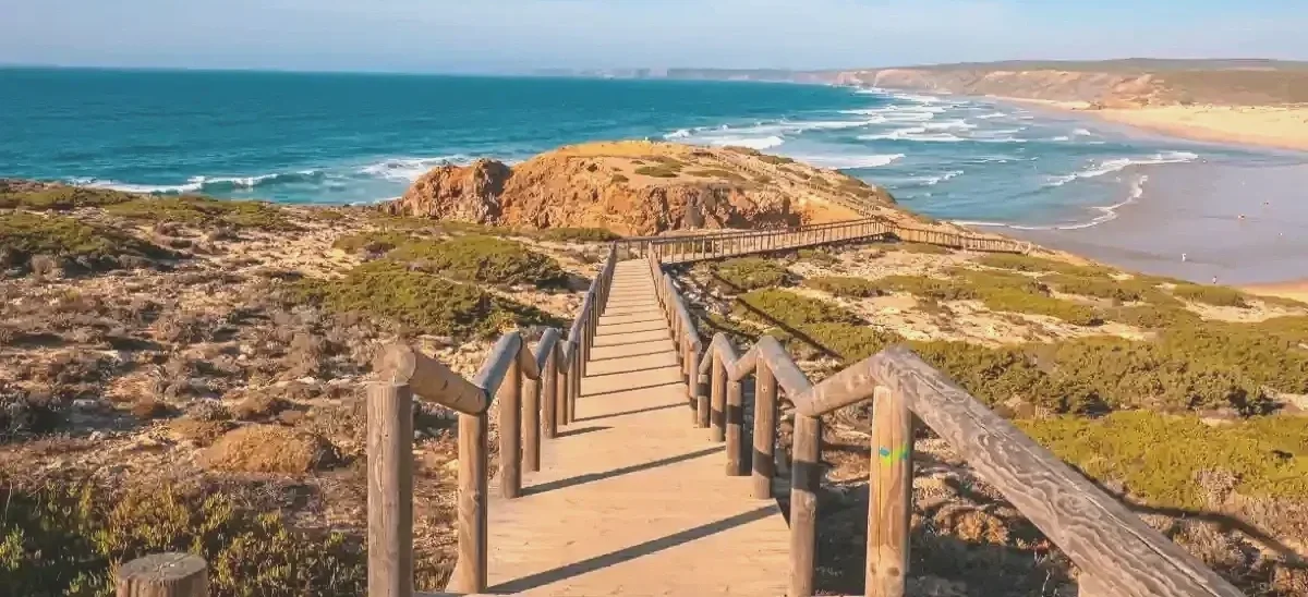 The west coast faces the full force of the Atlantic. Here you’ll find cliffs in shades of black and ochre, broad beaches backed by dunes, and waves crashing with the kind of power that draws surfers from across Europe. Beaches like Praia da Bordeira and Praia do Amado stretch wide and wild, often uncrowded even in July and August. The wind is a constant companion, refreshing by midday, sometimes fierce by late afternoon. This is terrain for hiking, photography, and contemplation.